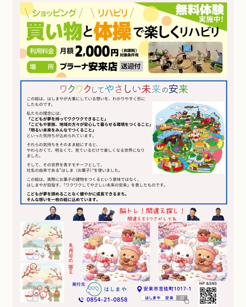 今月号の裏面は…はしまやの大事にしている想い‼️一度読んでいただけましたか?😆ワクワクしてやさしい未来の安来を目指して..そして“運動する場所”ではなく“出かけたくなる場所”に📍買い物もできる🛒人と会える✔︎体も動かせる🚶それが、はしまやらしいフレイル予防のカタチです💁♂️さらに毎度好評の間違い探し‼️ぜひ挑戦してみてくださいね👍😁よい3連休を☀️