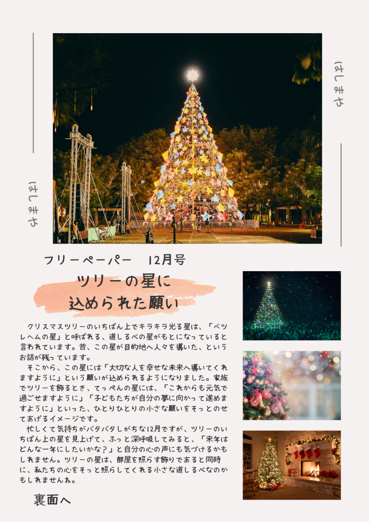 今月の瓦版では、「ツリーの星に込められた願い」をテーマにお届けしています🎄⭐️クリスマスツリーの一番上で輝く星🎄ただの飾りではなく、大切な人を導き、幸せな未来へつながっていきますように!そんな想いが込められていると言われています💫忙しくて気持ちがせわしなくなりがちな12月!ふとツリーを見上げて、「来年はどんな一年にしたいかな?」そんな風に、自分の心の声に耳を傾ける…