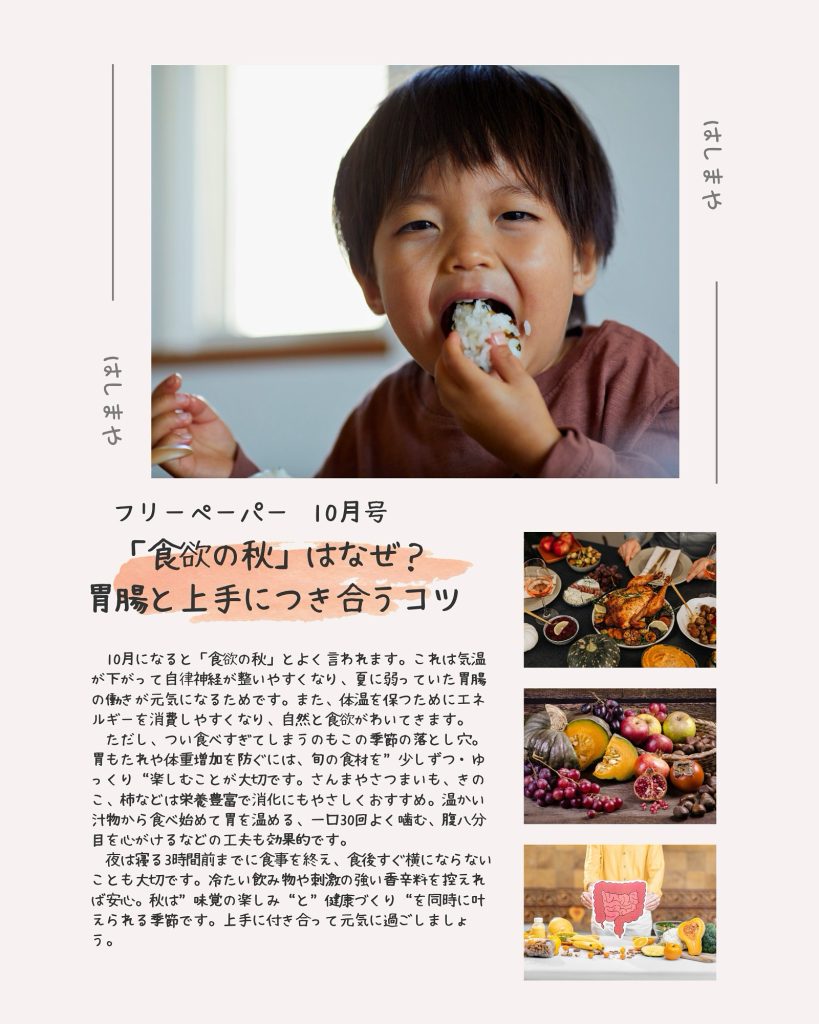 朝晩の空気がひんやりしてきましたね!今月の瓦版では、まさにこの季節にぴったりなテーマ『食欲の秋』についてお届けしています😆なぜ秋になると食欲がわくのか?そして、胃腸と上手に付き合うコツは??体を温める食材を意識したり、「少しずつ・ゆっくり噛む」を心がけることで、季節の変化に負けない元気な体を保てます💪是非ご一読くださいね✔︎金曜日頑張っていきましょう🙆♂️<…